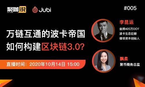 主持人:欢迎大家来到聚咖说直播间,本期直播主题「万链互通的波卡帝国,如何构建区块链3.0」。我是聚币商务总监飘柔。近日,波卡创始人Gavin表示,波卡平行链预计年底或明年初上线。我们知道,自8月底波卡项目代币DOT100倍拆分后,波卡市场热度一直未减,越来越多的人开始认可波卡生态的发展,不少人认为,波卡是最有可能超越以太坊,并且对区块链的发展作出巨大贡献的公链项目。本期我们邀请到的访谈嘉宾是坐拥420万波卡的早期投资人,波卡巨鲸,德邻资本创始人李昆运。
