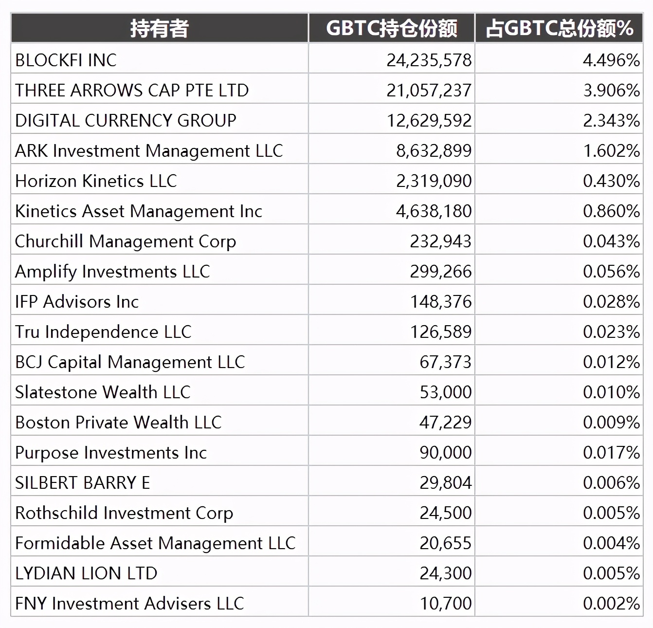 其实,上面那份名单只是灰度购买者里很小的一部分,稍稍计算一下你会发现,上图中所有的机构份额加起来,也不到GBTC总量的15%——更多的持股人信息并没有在市场上公开,那股躲在灰度背后的神秘力量如非自愿披露,普通大众或许永远都无法得知其真实面目。