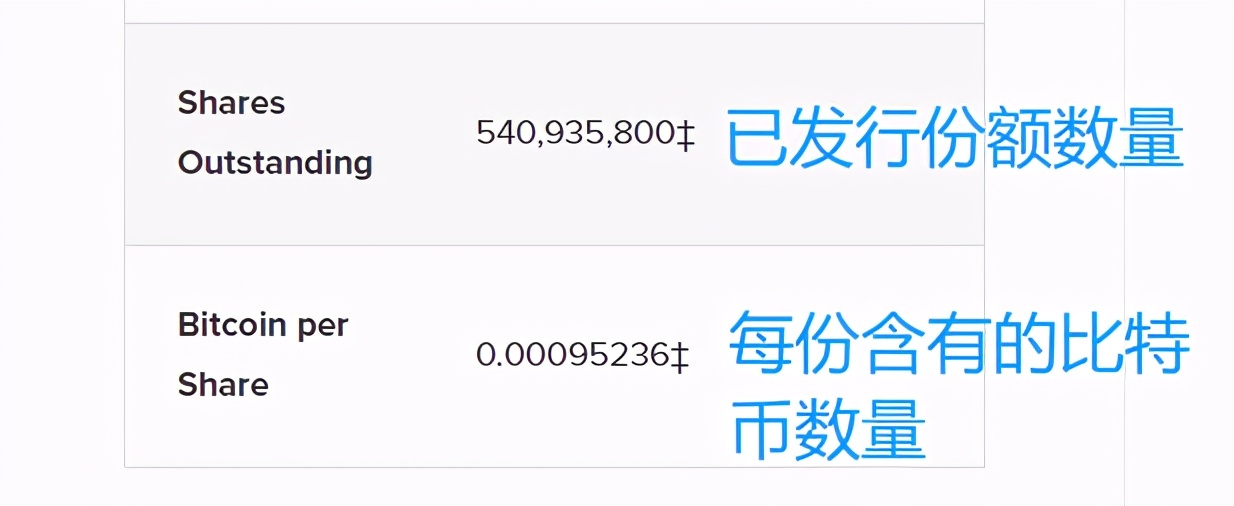 GBTC每年2%的管理费是用币本位收费,所以随着时间增加,每一份GBTC的比特币含量将越来越少。2013年发布时,GBTC的每股份额大约为0.001枚比特币,购买1000股才拥有1个比特币,而现在一份GBTC份额只含有0.00095236枚比特币。