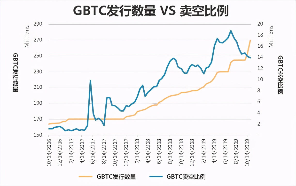 通过对比观察GBTC的发行数量和卖空比例,我们可以发现,每当GBTC发行数量减缓时,市场做空的比例就开始停滞甚至减少。