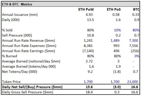 为了计算的方便,假设 80% 的矿工开采量用于出售,每天卖出大于 1.08 万 ETH( 约为 1800 万美元 )。除去约为 200 万美元的费用,将产生 1600 万美元的净流出。合并之后,市场抛售压力将降至为零,而且还会有 30 万美元 / 天的结构性流入。简单来说,合并前,ETH 需要 1800 万美元流入才能防止价格下降;合并之后需要 30 万美元的流出才能阻止价格上涨。