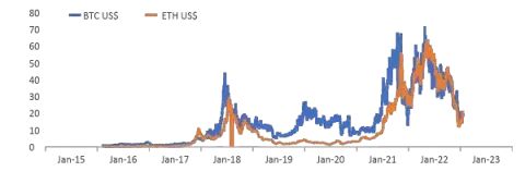 尽管目前 ETH 的市值较小,但在市值加权的基础上,其发行量却大了约 3 倍,大规模的发行也使得 ETH 的市值很难超过比特币。市值是已发行代币和代币价格的乘积。