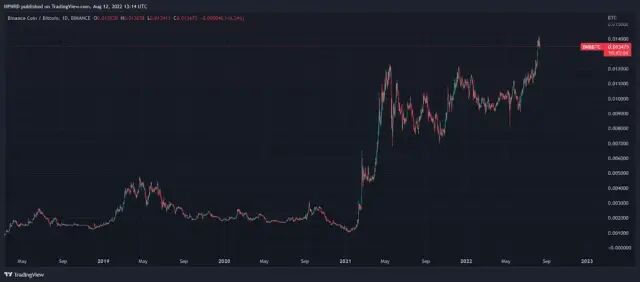 从长远来看,未来变得更容易预测,因为结构性流动变化将起到关键作用,这是合并的影响最明显的地方。只要以太坊的网络采用率不断提高,结构性需求将保持不变,并且还将促进进一步的资金流入。这应该会导致持续的升值,预计以太坊将在未来几年内超越比特币成为最大的加密货币,因为流量是加密货币中最重要的变量。以太坊在合并后将顺风顺水。比特币将一直面临逆风。BNB/BTC 图表是一个很好的启示。