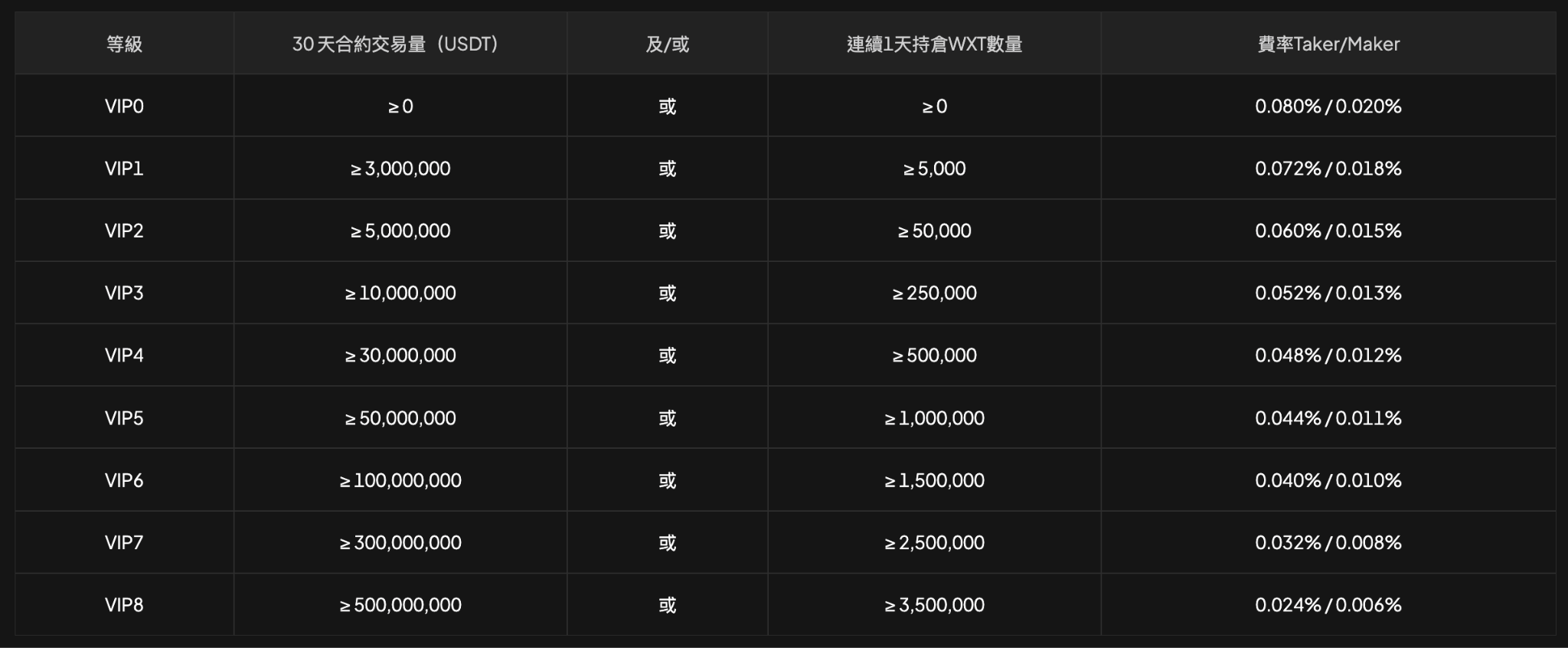 ● 随着 30 天合约交易量或 WXT 持仓量递增,对应 VIP 等级上升;