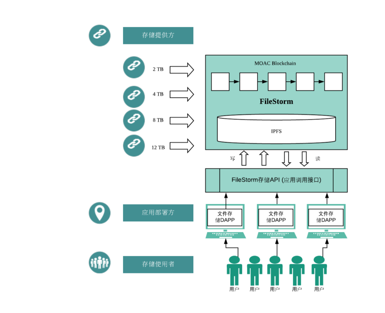 存储提供方:存储提供方将会提供用于存储的硬件设备,如带大容量硬盘的电脑,或者订制的硬件盒子。设备仅需安装FileStorm程序,用于链接墨客FileStorm的子链和IPFS网络。(为FileStorm提供存储可以得到收益,也就是存储挖矿。)