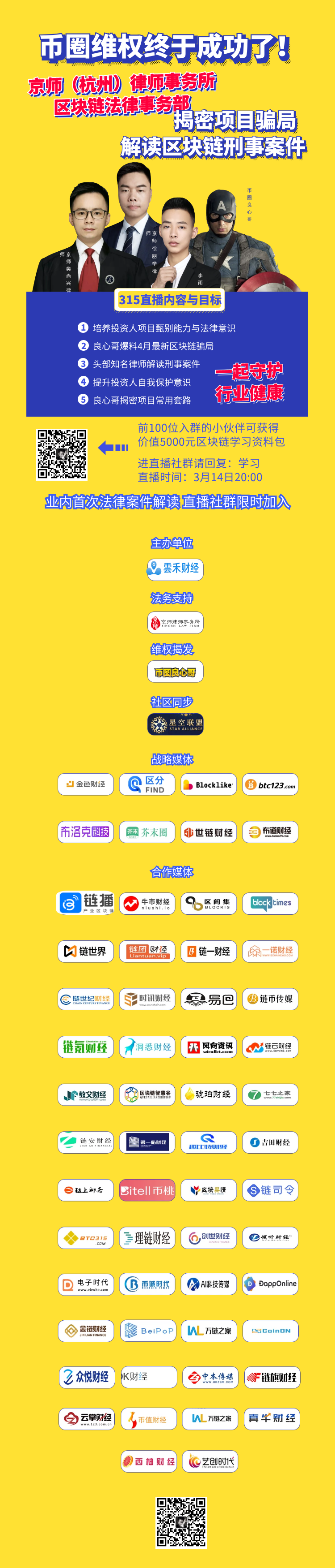 就在315前夕,为促进区块链市场经济良性发展,保护投资人财产安全,维护消费者合法权益不受侵害。营造一个公平、公正、诚信经营的消费环境,帮助更多人保护自己合法权益,促进市场经济良性发展,雲禾财经为广大区块链投资人邀请到了京师(杭州)律师事务所区块链法律事务部樊尚兴律师、徐朋举律师,与拥有币圈美国队长之称的:币圈良心哥,为我们大家带来最新的区块链案件解读和内幕爆料。