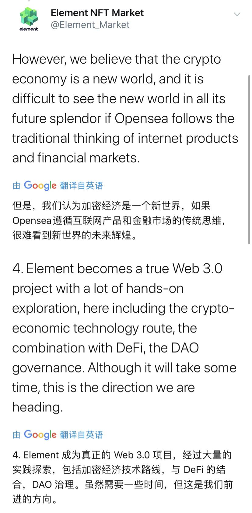 2,Element兼容Opensea用户交易操作习惯的同时又推出了流畅易用的App;