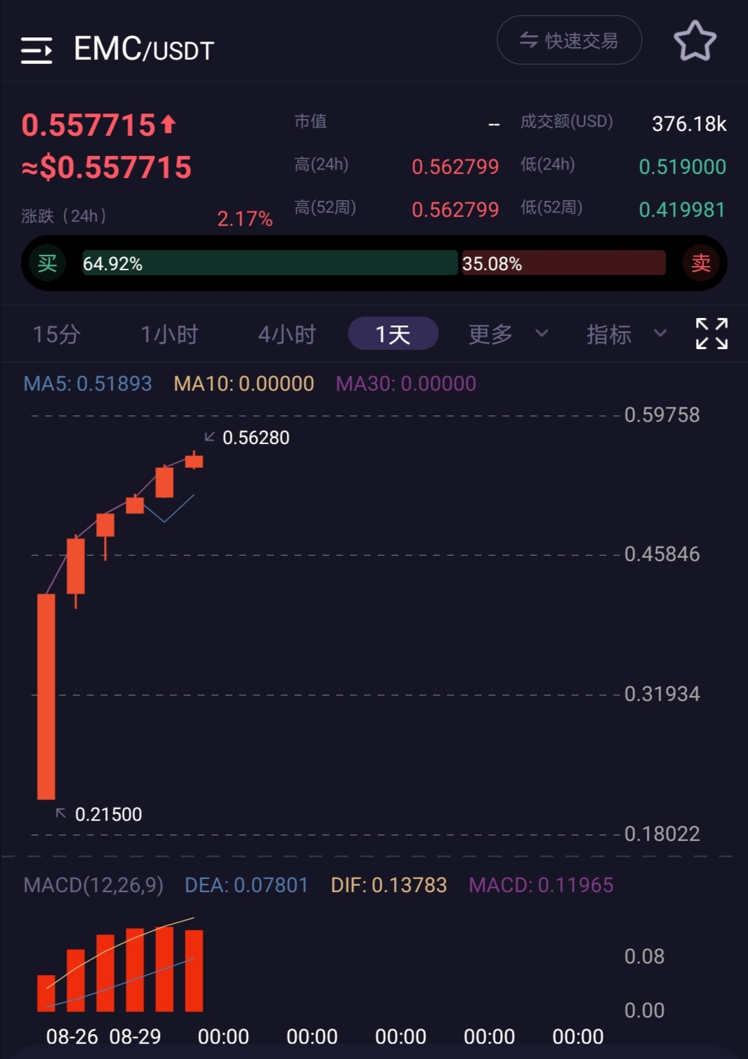 昨日,EMC开采链在币赢24小时交易量突破历史新高,达68万!上线不到一周,EMC价格一路飙升!