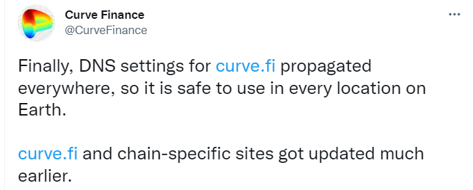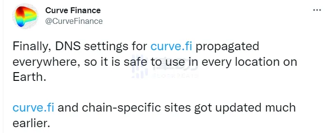 8 月 11 日,Curve Finance 发文表示,curve.fi 的所有域名服务器均已完成 DNS 设置,因此 curve.fi 已可安全使用。此外 Curve 发布了有关本次攻击事件的简报,表示协议受到攻击的原因是 DNS 缓存中毒,而不是域名服务器被盗用。 BlockBeats 此前报道,8 月 10 日,Curve Finance 在社交媒体表示其网站前端被攻击,提醒用户如果在数小时内使用过 Curve 请立即解除授权。据 KOL Zachxbt 表示,黑客已窃取价值 570,000 美元的 ETH,并已转移到 FixedFloat。[原文链接]